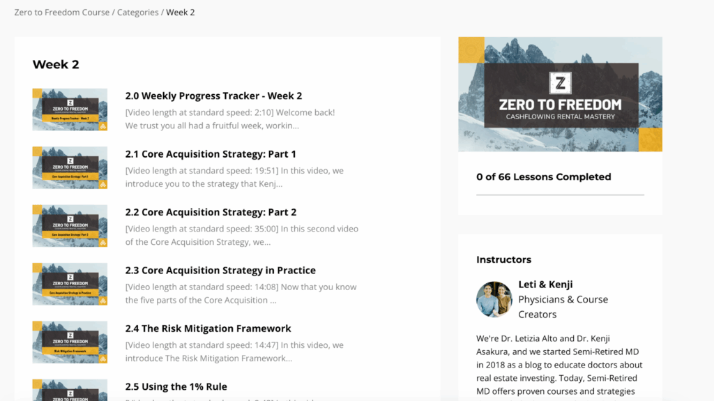 Once the course starts, you get access to a new module every week or two. Each module has a number of videos with Leti and Kenji on related topics covered in that week. There are also usually 1 to 2 interviews with pertinent real estate professionals (mortgage brokers, insurance agents, etc) relevant to the topics discussed in the module.