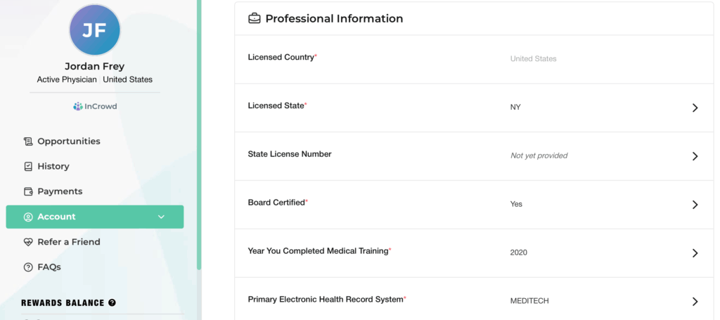 The whole process is pretty simple. You sign up and fill in your information like specialty, etc. so that you can match with appropriate survey opportunities. I will also point out that you can pick and choose what data to input. Even though everything they ask is pretty much publicly available (see below).
