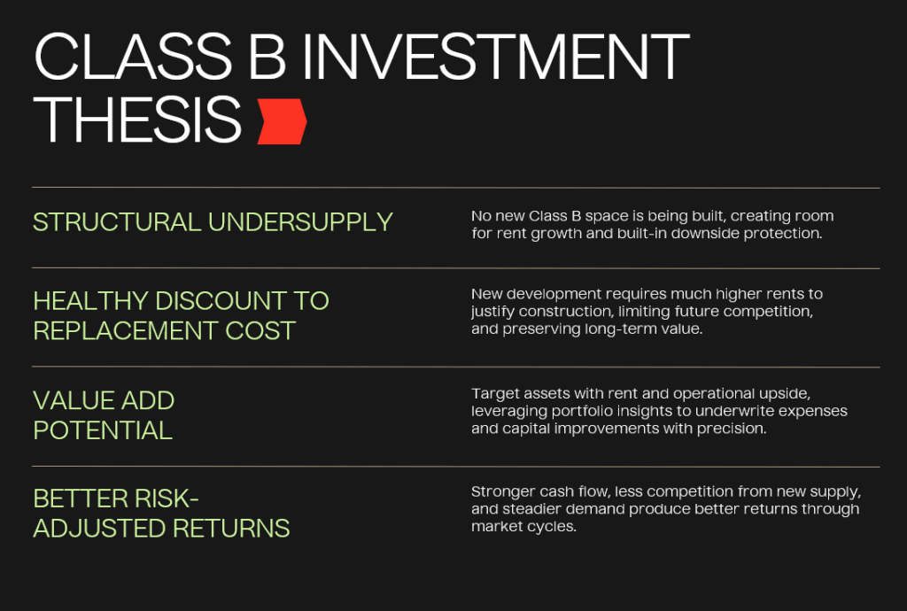 That gap has brought renewed interest in Class B properties. They tend to cost less to buy, produce steady income, and attract tenants who stick around because they value affordability and convenience.