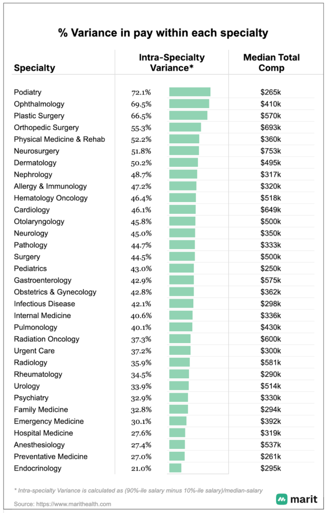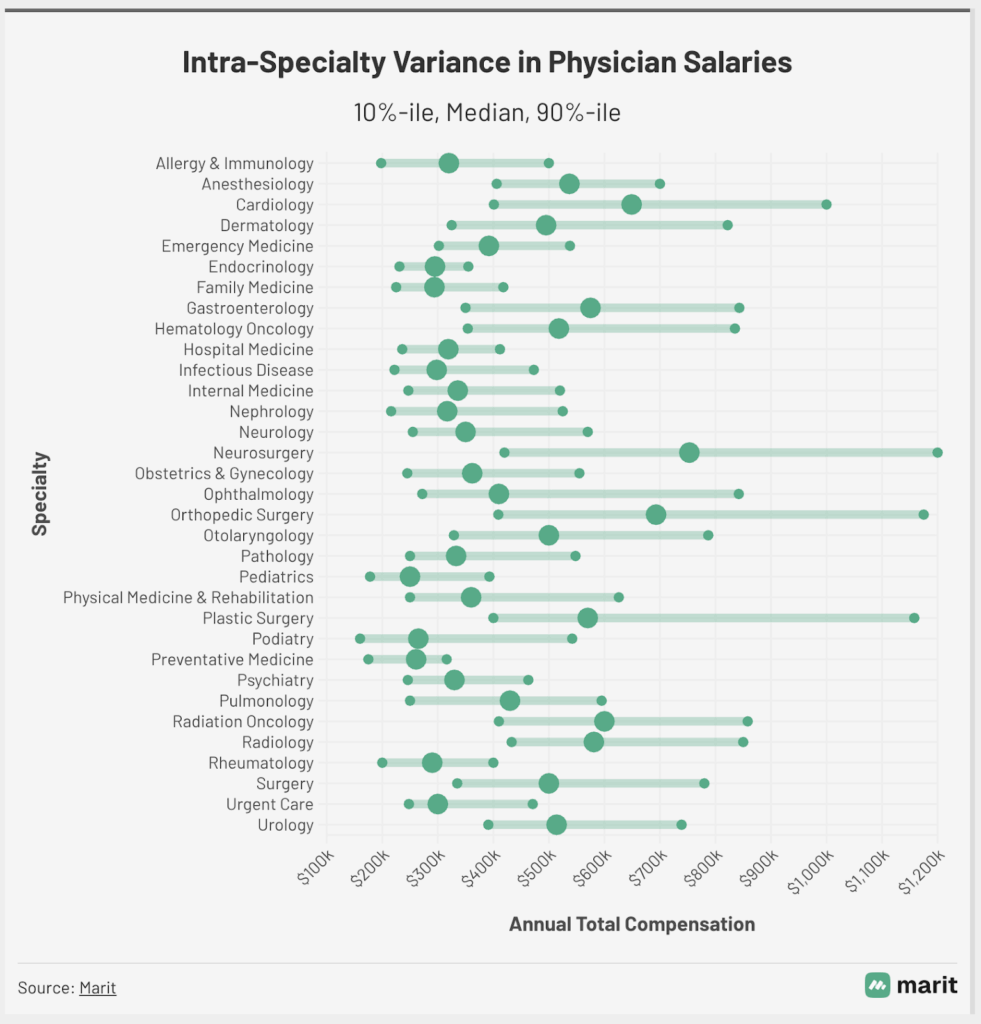 The most useful insight from the Marit dataset is not which specialties earn the most. It is which specialties have the widest income range. That range determines how much control you have over your compensation.